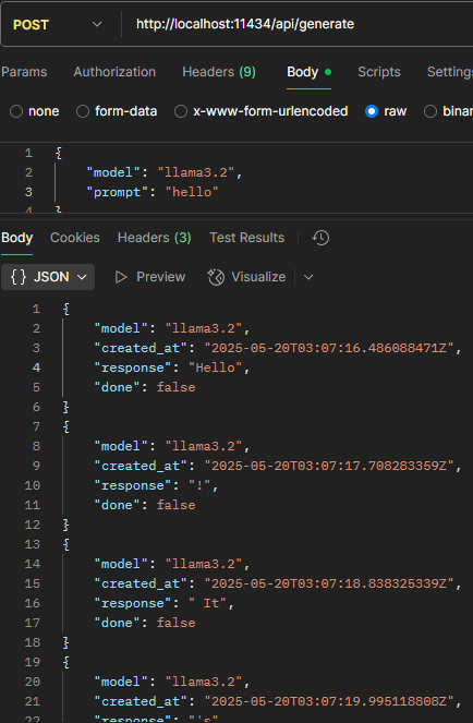 POST http://localhost:11434/api/generate { "model": "llama3.2", "prompt": "hello" } - 정상적으로 응답이 오면 성공입니다.