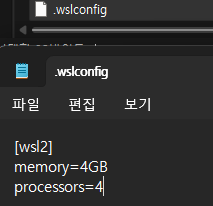 C:\Users\<사용자이름>\.wslconfig(예:C:\Users\CurrentUser\.wslconfig) - 파일 생성/편집:
